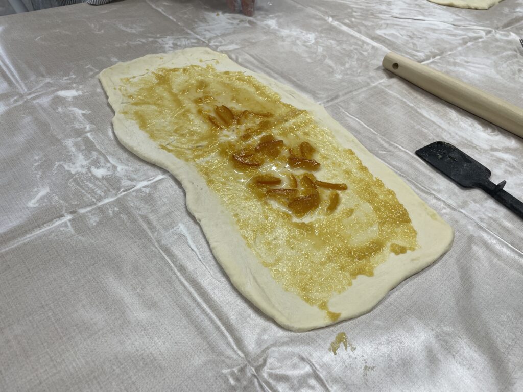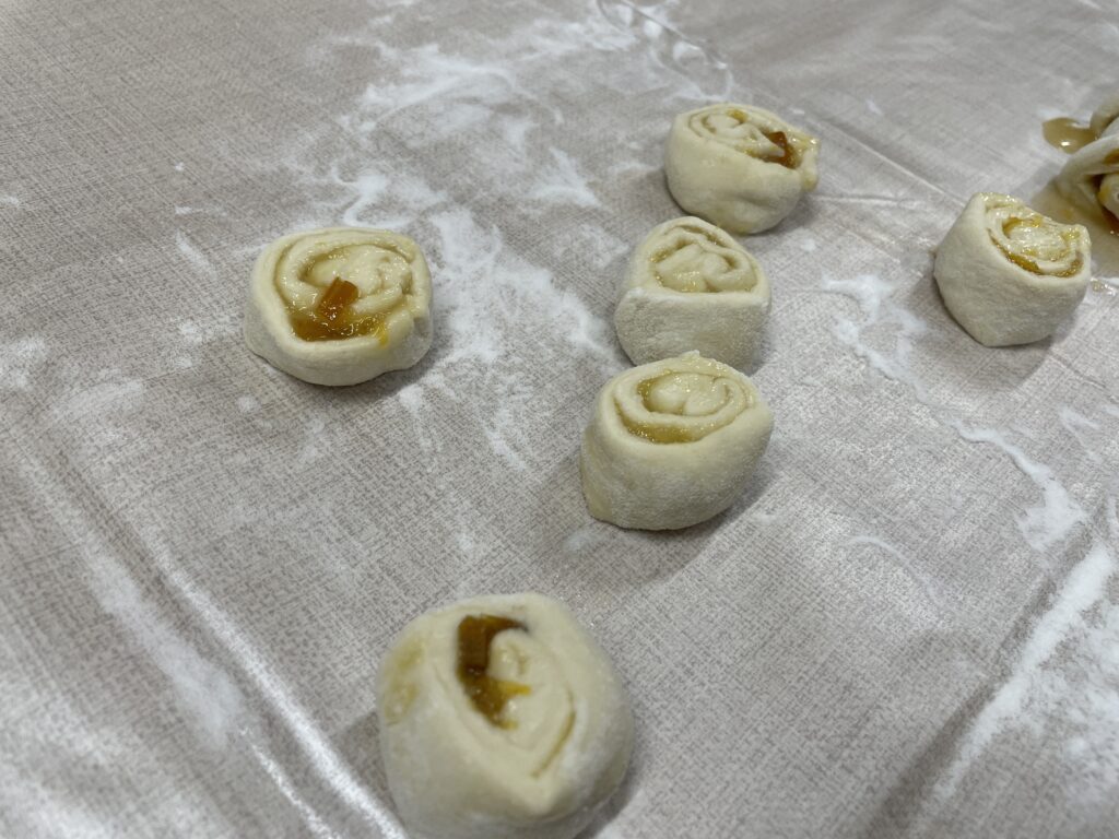 ピザ生地に先日作ったポーポのジャムと、マーマレードのジャムを挟んでクルクル巻いて焼きました‼️✨